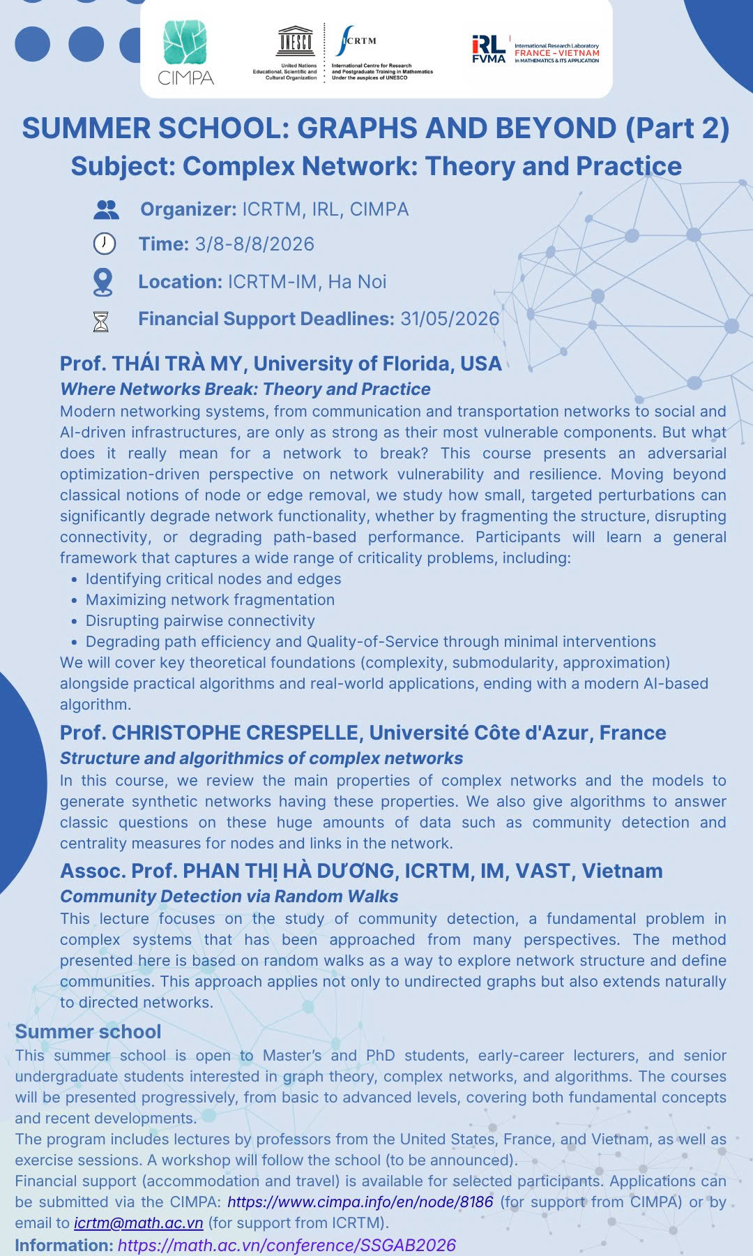 This summer school is open to Master’s and PhD students, early-career lecturers, and senior undergraduate students interested in graph theory, complex networks, and algorithms.