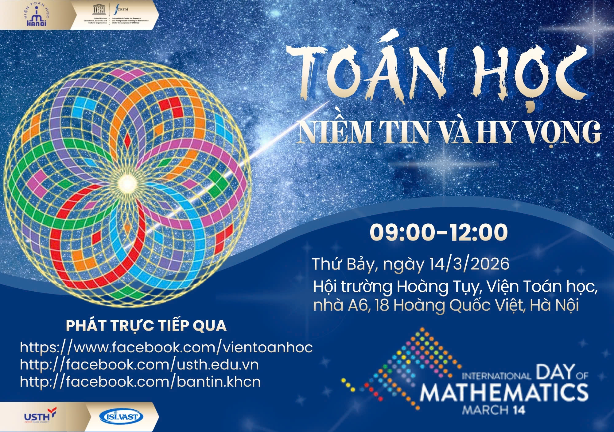 và Livestream trên Fanpage Viện Toán học và các đơn vị đồng tổ chức (https://www.facebook.com/vientoanhoc; http://facebook.com/usth.edu.vn; http://facebook.com/bantin.khcn)